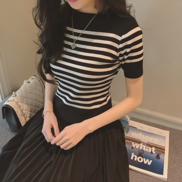 2016春裝針織T恤女新品修身打底衫韓版條紋百搭短袖上衣秋季潮 /