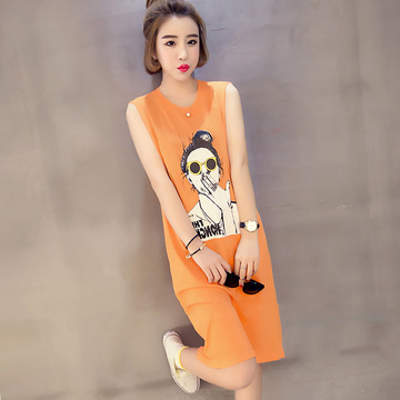 無袖 頭像印花 中長款 圓領百搭BF上衣 女T恤 連衣裙 夏 韓版寬松 /