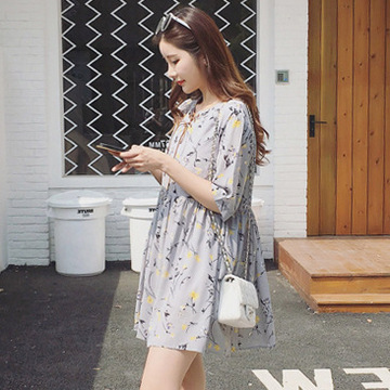 寬松 五分袖 雪紡 印花系帶 韓版 小清新 A字 連衣裙 女夏 娃娃衫 /