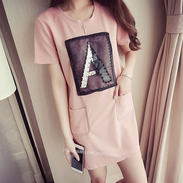 釘珠 貼布 字母 韓版 中長款 T恤 圓領百搭 雙口袋 連衣裙 女夏潮 /