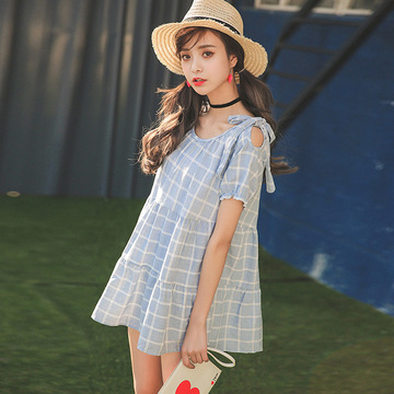 小清新 韓版 露肩 泡泡袖 格子棉麻 寬松 蓬蓬娃娃衫 連衣裙 女夏 /