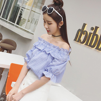 一字領 條紋 短袖 露肩 寬松 百搭上衣 韓版 女士襯衫夏 小清新潮 /