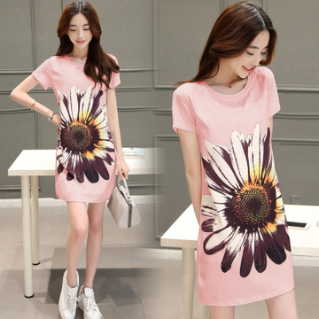 實拍2016夏裝短袖t恤連衣裙女中長款寬松大碼立體印花韓版女 /