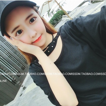 韓國女裝 原宿風 鏤空鉚釘掛脖寬松大碼五分袖潮款打底T恤 /