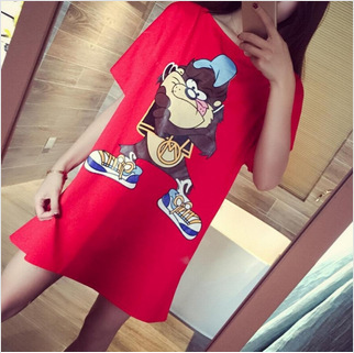 2016夏款一字領(lǐng)露背鏤空顯瘦卡通t恤時尚寬松長款大碼連衣裙 /