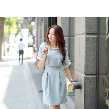 2016夏季新款韓版女裝水洗牛仔藍色棉麻修身連衣裙女士短袖裙子 /