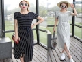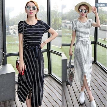 韓國顯瘦短袖連衣裙女夏秋韓版莫代爾一步裙修身休閑條紋開叉長裙 /