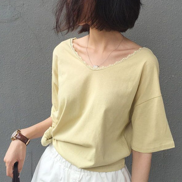 原宿bf風(fēng)純色V領(lǐng)蕾絲拼接寬松短袖T恤女夏季基礎(chǔ)百搭純棉上衣韓版 /