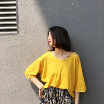 蕾絲破洞原宿bf風(fēng)純棉V領(lǐng)短袖T恤女中長款夏季寬松大碼女裝上衣 /
