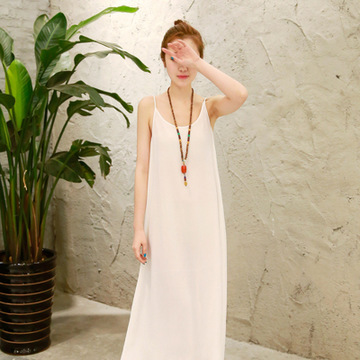 實(shí)拍2016夏季新款棉麻純色無袖黑色打底吊帶背心裙女中長款 /