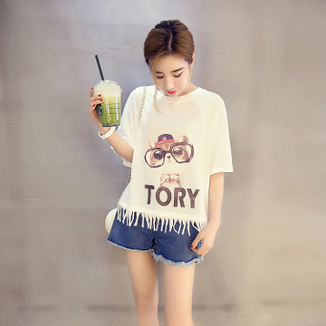 小穎家 保證質量韓版寬松顯瘦圓領流蘇百搭印花短袖T恤衫 女 /