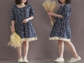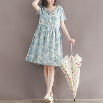 一件代發夏季大碼女裝文藝小清新海軍風棉麻印花短袖寬松連衣裙潮 /