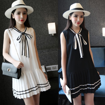 2016夏季新款 V領蝴蝶結系帶 百褶拼接雪紡無袖連衣裙女 /