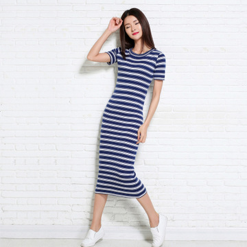 2016夏季新款韓版短袖針織裙連衣裙女長款海軍風(fēng)顯瘦條紋長裙子 /