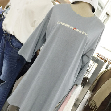 韓國東大門春裝2016新款SKY簡約中長款開衩圓領字母印花T恤衫女潮 /