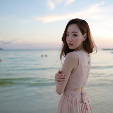 夏韓國新款女裝背心長裙沙灘裙性感露背無袖大擺雪紡連衣裙 /