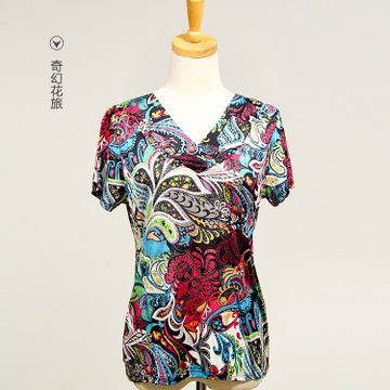 查米夏新款100%針織真絲媽媽裝T恤短袖直筒V領大碼5根絲真絲上衣 /
