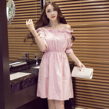 2016夏季新款名媛小香風荷葉袖中長款一字領露肩連衣裙 /