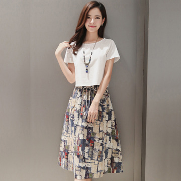夏季韓版棉麻小清新文藝范復古寬松緊腰短袖連衣裙子女兩件套裝裙 /