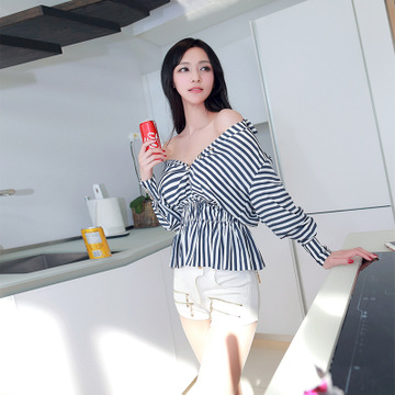 夏裝新款性感露肩V領度假高腰長袖收腰顯瘦雪紡衫打底襯衣襯衫女 /