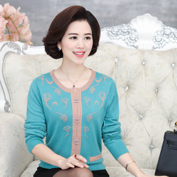 中老年媽媽裝圓領(lǐng)針織打底衫秋裝新款長袖大碼女裝燙鉆印花毛衣 /