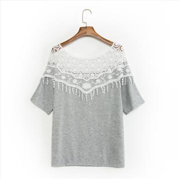 速賣通熱賣蕾絲拼接短袖圓領蕾絲衫 /