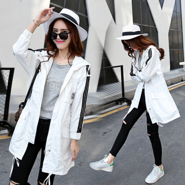 歐美韓版秋天新款女中長款字母印花連帽收腰系休閑帶風(fēng)衣外套 /