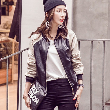 韓版秋季女裝修身長袖短款拉鏈拼接顯瘦皮衣機(jī)車夾克外套女 /