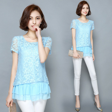 蕾絲衫短袖夏裝新款大碼女裝韓版寬松假兩件拼接雪紡衫 /