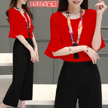 夏裝新款 韓版大碼女裝雪紡衫時尚套裝 休閑闊腿褲兩件套女夏 /
