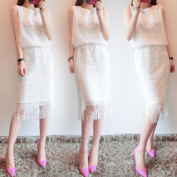 東大門代購6夏裝新款韓版寬松無袖蕾絲流蘇中長款連衣裙 /