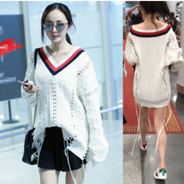 楊冪同款毛衣秋新款女白色V領寬松中長款套頭鏤空流蘇針織衫 /