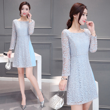 秋韓版長袖蕾絲連衣裙女百褶修身打底雪紡裙子 /