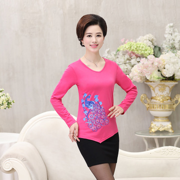 中老年女裝印花V領長袖t恤女媽媽裝40-50歲大碼修身上衣春秋裝薄 /