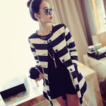 早秋新款歐美走秀款黑白粗條紋大衣中長(zhǎng)款長(zhǎng)袖外套女 /