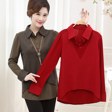語柳新款媽媽裝襯衫上衣女裝秋冬羊毛長袖T恤中老年假兩件套 /