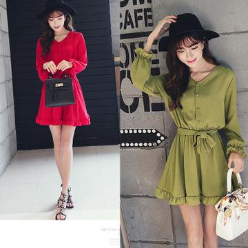 女士時尚連衣裙新款韓版純色套頭T恤女長袖時尚荷葉邊女裝潮 /
