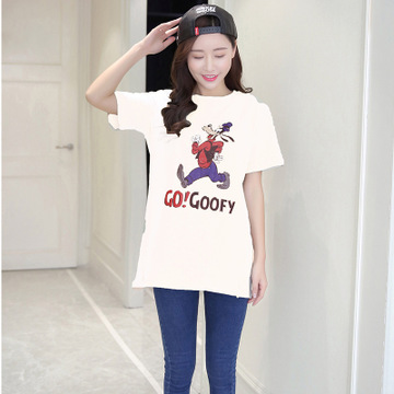 新款韓版高飛狗卡通印花T恤寬松中長(zhǎng)款側(cè)開(kāi)叉短袖t恤女純棉 /