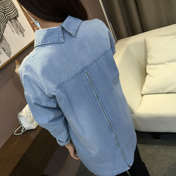 絲雨女裝寬松長袖開扣襯衫歐美風后背拉鏈翻領牛仔上 /