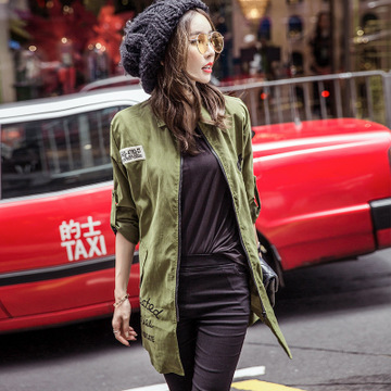 實(shí)拍 秋裝新款中長(zhǎng)款寬松長(zhǎng)袖BF風(fēng)字母印花軍綠色風(fēng)衣襯衫 女 /