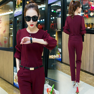 春新款韓版女裝圓領雪紡針織襯衫獨特長袖小腳褲潮流時尚套裝 /