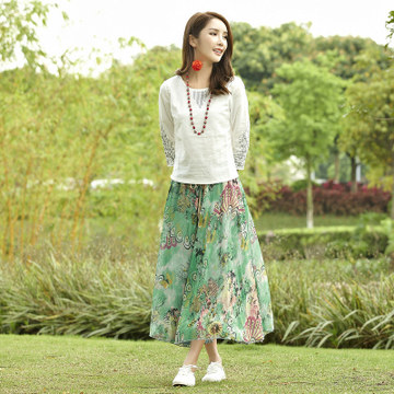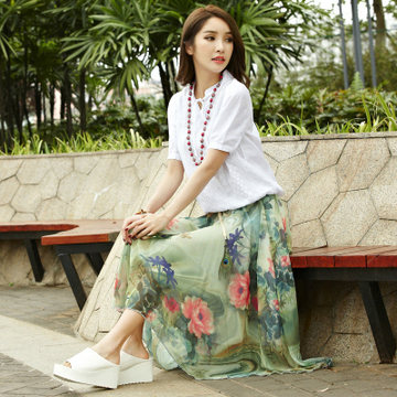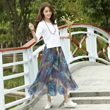 春夏新款女裝民族風長裙印花雪紡半身裙百搭大擺裙半身長裙子 /