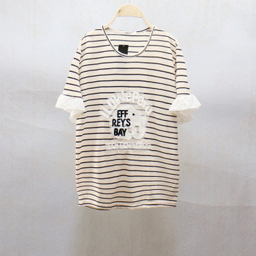 夏季新款韓版條紋蕾絲袖純棉T恤女士休閑短袖上衣 /