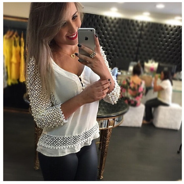 廠價直銷速賣通熱銷歐美V領網布白色花邊襯衫 /