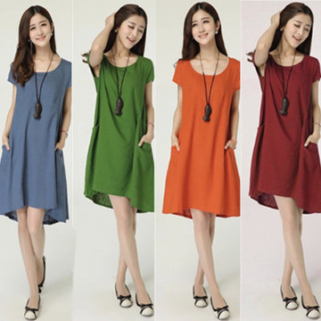 大碼女裝夏季棉麻連衣裙薄款短袖寬松腰韓版中長款亞麻裙子 /