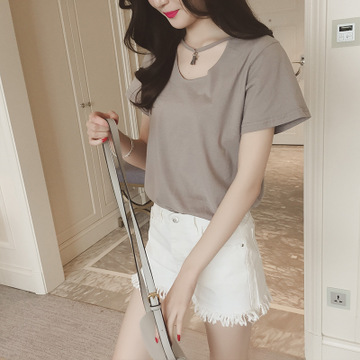 夏季女裝新品韓國簡約舒適打底衫個性設計領口流蘇裝飾短袖t恤女 /