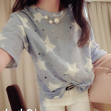 春夏新款歐美百搭顯瘦星星鉚釘破洞寬松短袖T恤女圓領6830 /