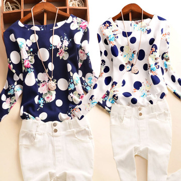 春裝新款 胖mm顯瘦 波點圓領 長袖t恤打底衫女上衣 /