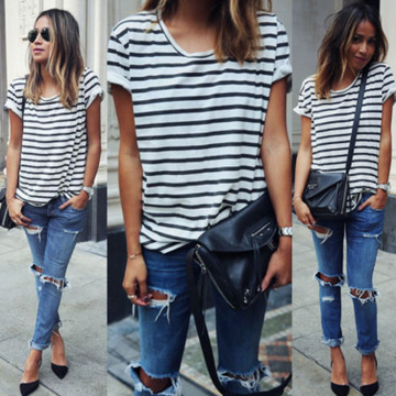 歐美新款女裝速賣通eaby熱賣爆款條紋性感百搭短袖T桖 /