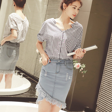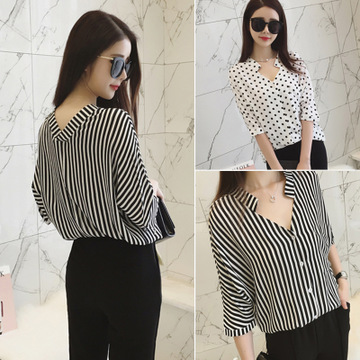 夏裝新款韓版顯瘦百搭V領豎條紋蝙蝠袖短袖中長款襯衣女上衣 /